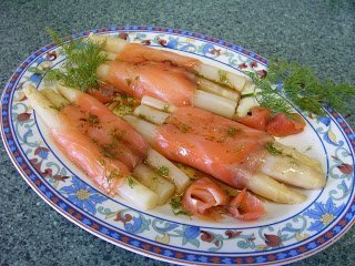 Colocar los esparragos y el salmón en una fuente, y rociarlos con la vinagreta.