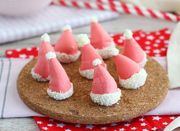 Funde chocolate y moja la base del gorro. Luego, pasalo por coco rallado. Haz lo mismo con la bolita.Bebida.