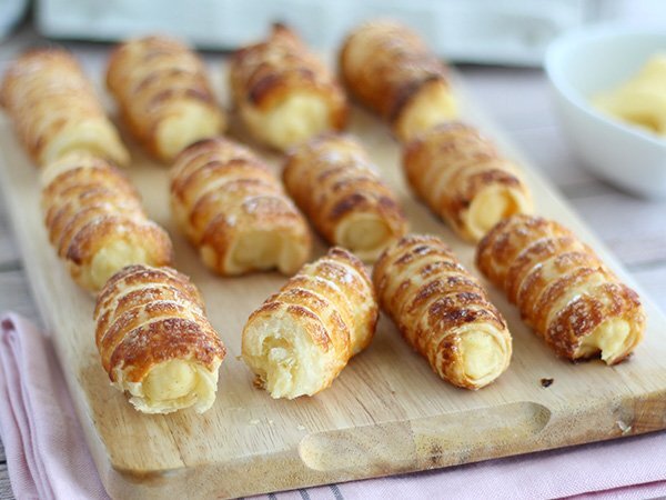 Pintar cada cannolo (rulo) con yema y luego espolvorear azúcar glas.