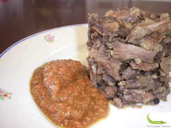 Entonces sacamos la carne y en una fuente separamos la carne del hueso, dejándola desmenuzada. Las verduras restantes, las pasamos por un pasapuré, deshechando el tronco de la cabeza de ajos, el laurel y los clavos. Quedará una salsa, que mantenemos caliente.