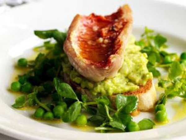 Extendemos el puré de habas generosamente por las rebanadas de pan, ponemos los filetes de salmonete en la parte superior. Colocar los guisantes y los brotes de guisantes en torno a las rebanadas y aliñar con la vinagreta.