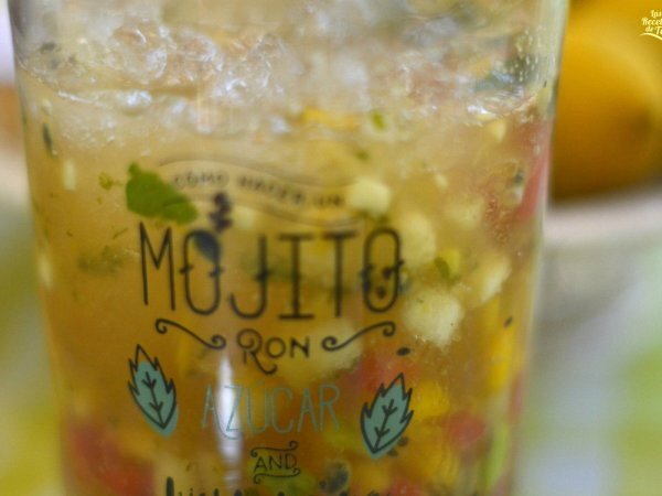 Machaca las hojas de hierbabuena en cada vaso con el palo del mortero o con un utensilio que venden para tal efecto, junto con el azúcar, el jugo de de la lima o limón, luego le añades el ron, la soda o la bebida gaseosa y la fruta que has cortado previamente y que tienes reservada. Por último el hielo picadito, revuelves y listo