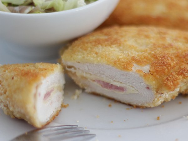 Colocar un tranchete de queso y medio de jamón por el lado que no está enharinado.