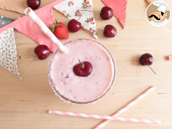 Triturar fresas + cerezas congeladas. Y disponer en un vaso batidor
