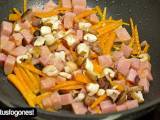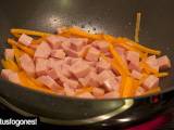 Ponemos a freir en el Wok con un chorrito de aceite el jamón cocido cortado en dados y la zanahoria cortada en tiras.