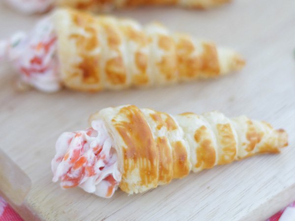 Conos de hojaldre con salmón y cebollino.