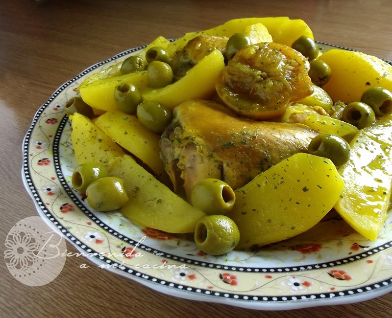 Cubrimos y dejamos al fuego aproximadamente una hora (hay que ir vigilando que no le falte agua o se queme). En los últimos 10 minutos de cocción añadimos las aceitunas y volvemos a cubrir el tajine.