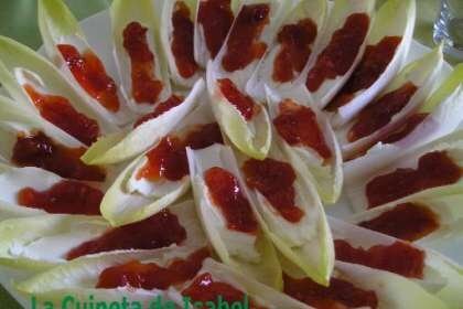 Separa las endivias en hojas, ayúdate con unas tijeras y corta en recto la parte final de cada hoja, cuidarás la presencia del plato, las lavamos y escurrimos.
